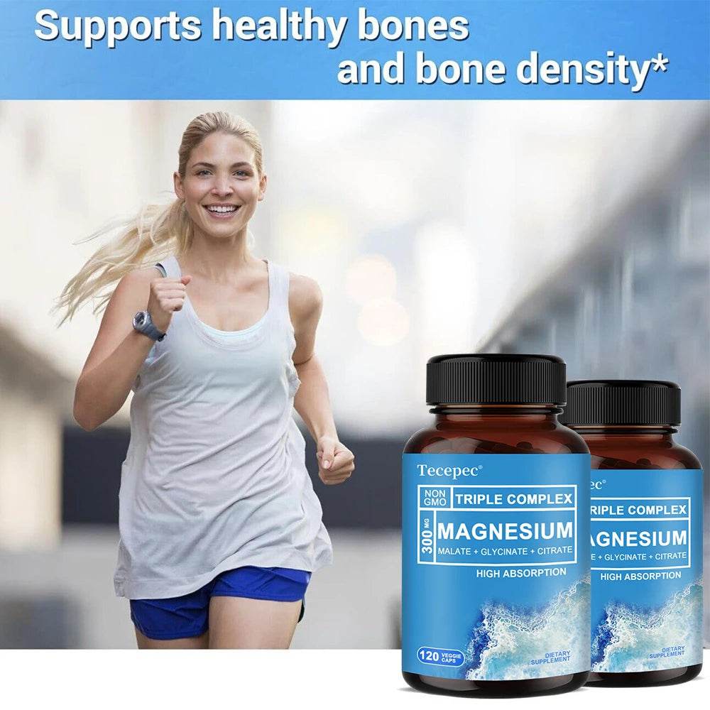 MAXIMUM ABSORPTION & EFFECTIVE MAGNESIUM SUPPLEMENT: Triple Magnesium Complex contains 300 mg of three pure forms of magnesium (Magnesium Glycinate, Magnesium Malate, Magnesium Citrate). Each is chelated or highly absorbable for maximum bioavailability. Our formula is stomach-safe and "unbuffered," in the form of magnesium glycinate, an essential nutrient that supports healthy muscle and nerve function. This helps support muscles and legs during nighttime workouts and promotes brain health* PROMOTE HEART HEALTH & ENERGY PRODUCTION: As a cofactor in hundreds of enzyme reactions, magnesium malate supports nutrient intake and promotes cellular energy production. Magnesium supplementation also helps support overall cardiovascular health. * Bone Density & Muscle Building: Studies show that magnesium helps regulate vitamins and nutrients like calcium and zinc to support healthy bones and strong bone density. Magnesium can also help support muscles after a workout.